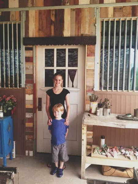 Clementine and Viggo in front of my father's new place. His house used to be a horse stall, my husband worked all of June to create the beautiful transformation. My father lives and paints here. It is small but really lovely.
