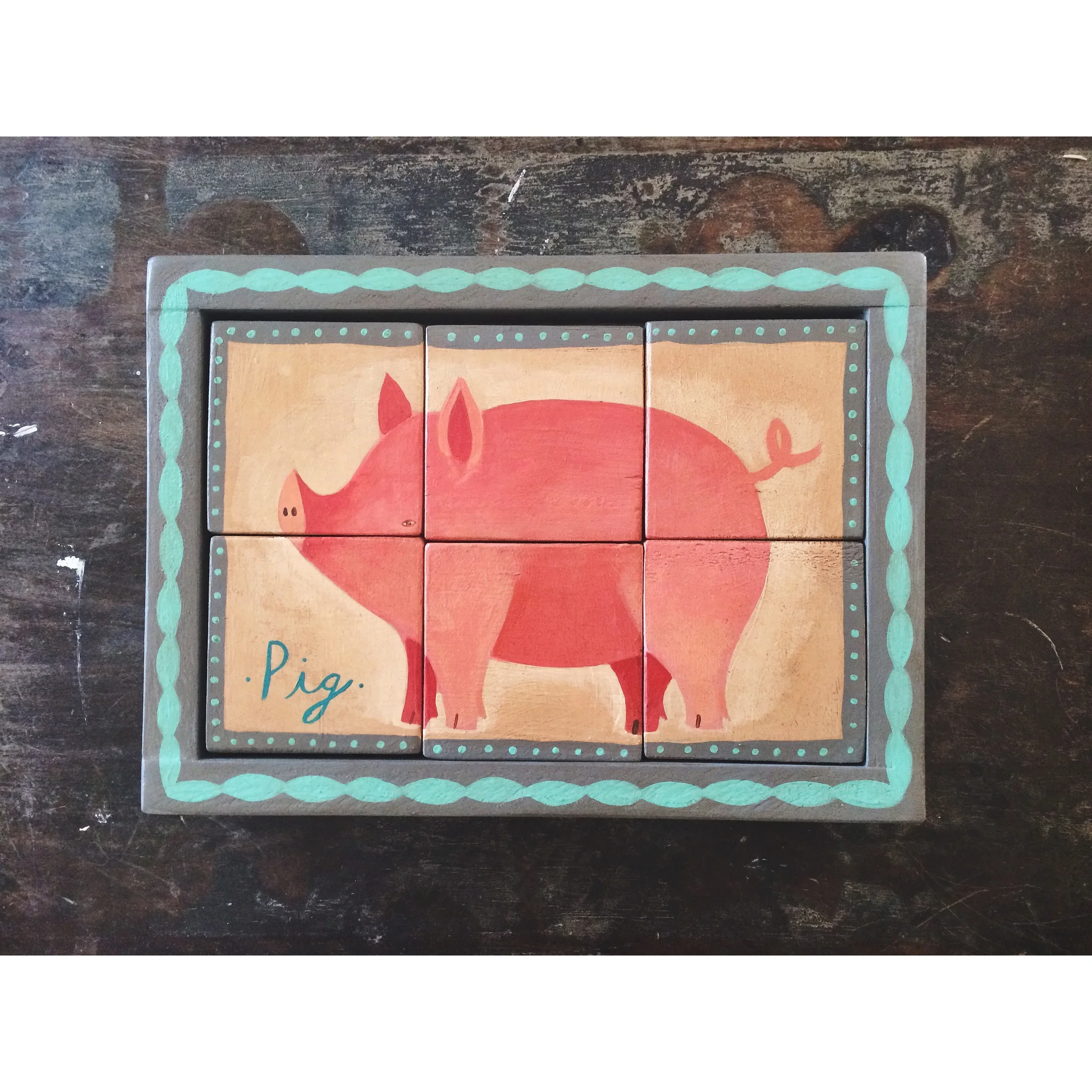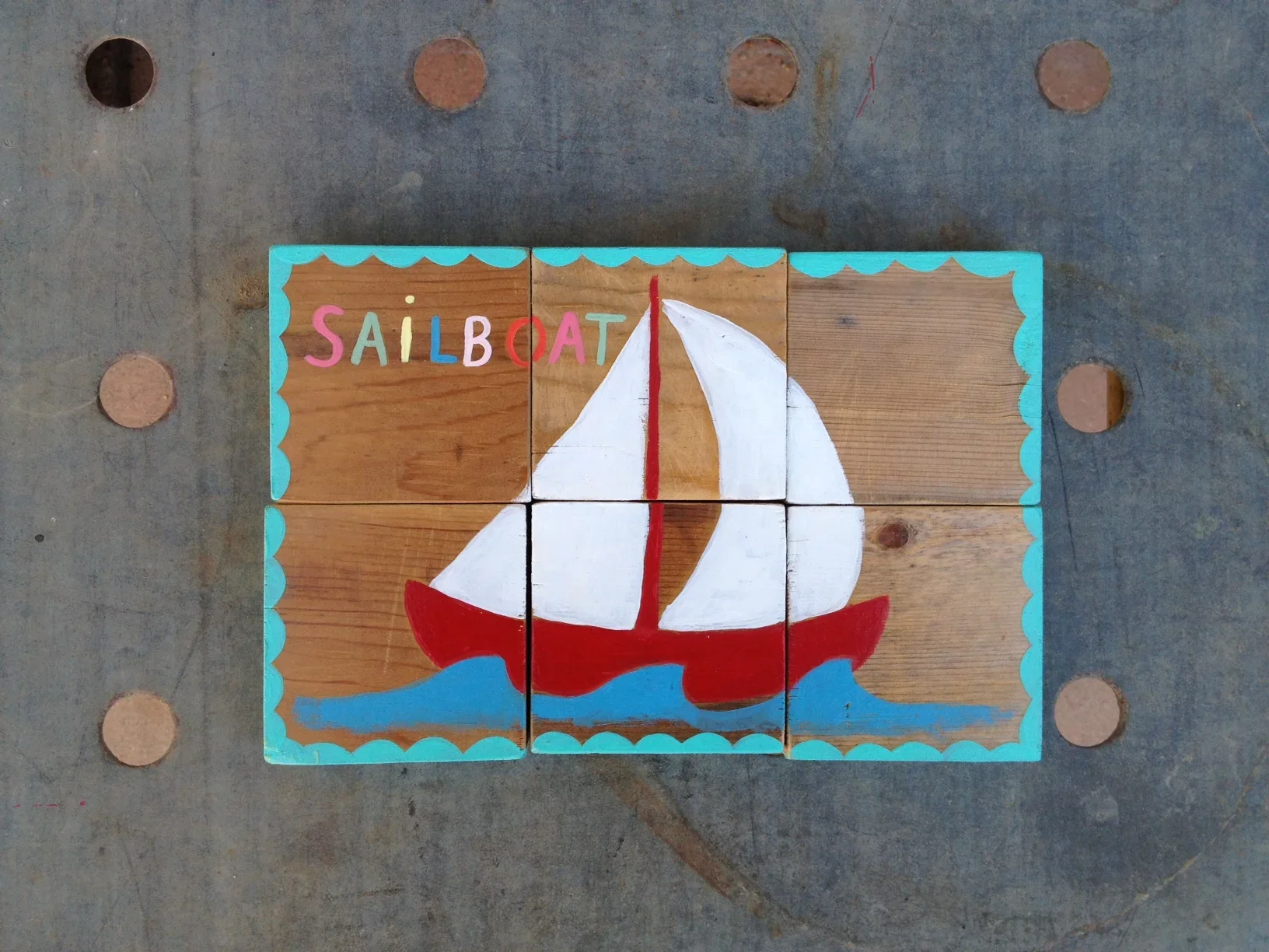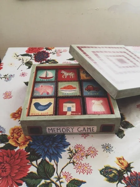 Memory Game. Handmade by me. 27 hand-painted wood block pieces. Handmade, hand-painted box. These take forever to paint. Spent many afternoons in June, cranking out these little images. This is only the fifth one I have ever made.
