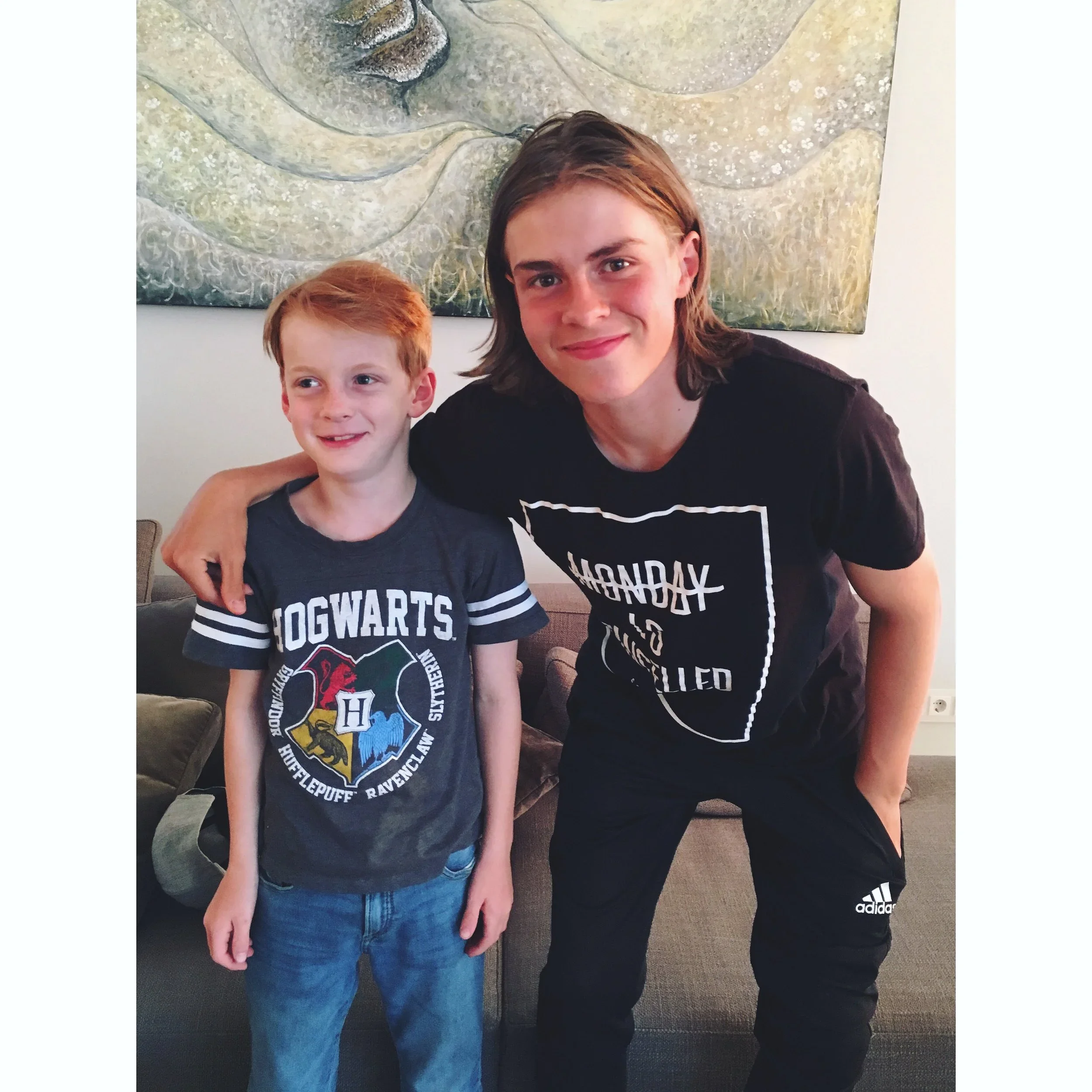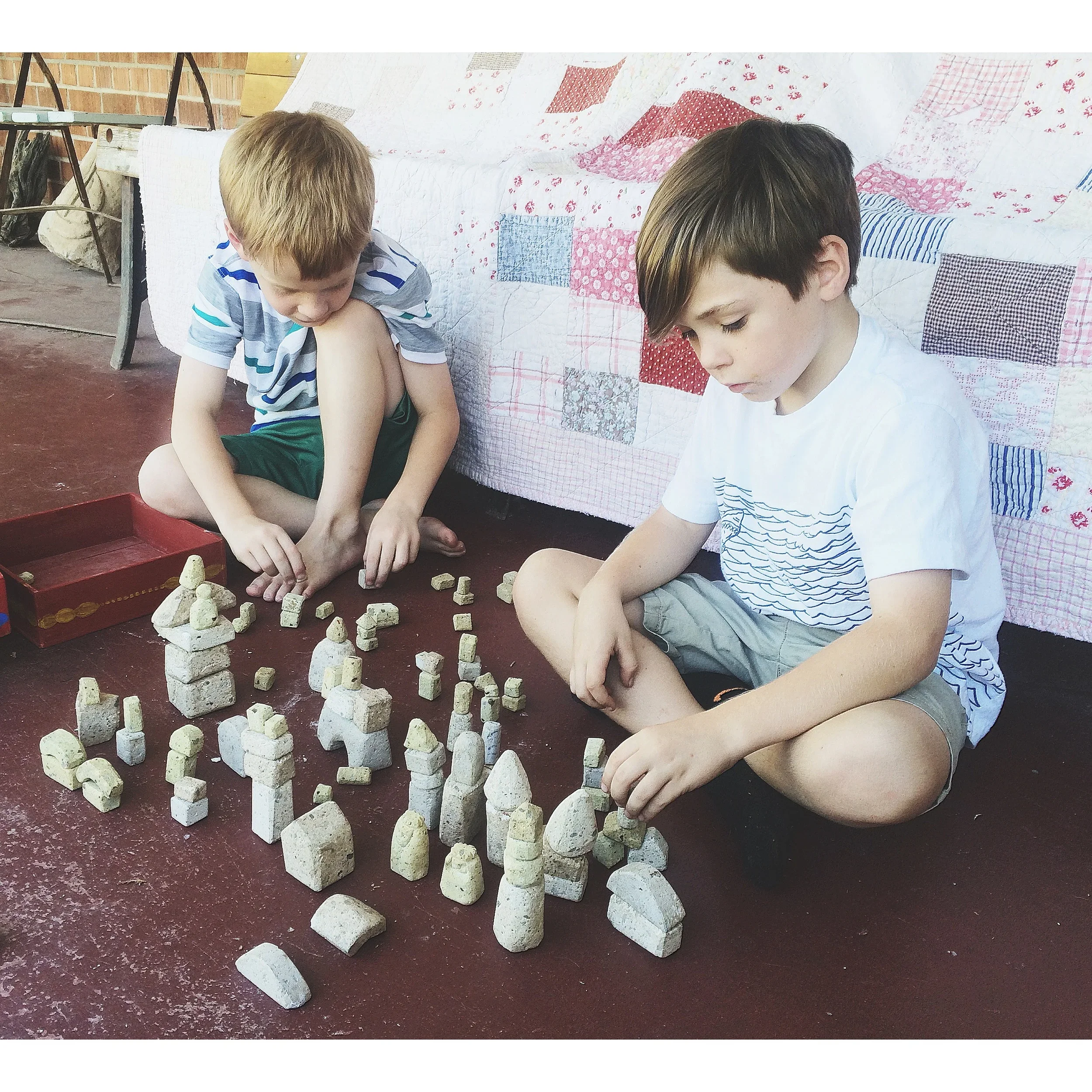 Viggo + Hendrix, playing with stone carved blocks, made by my father