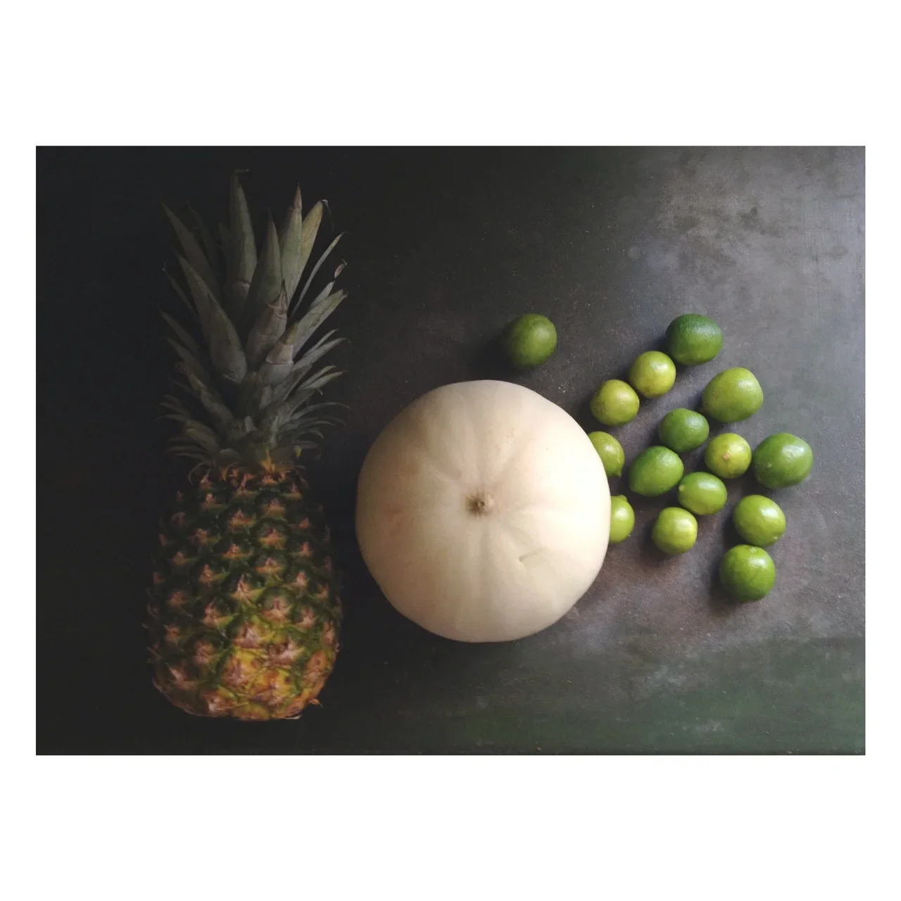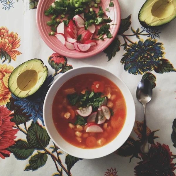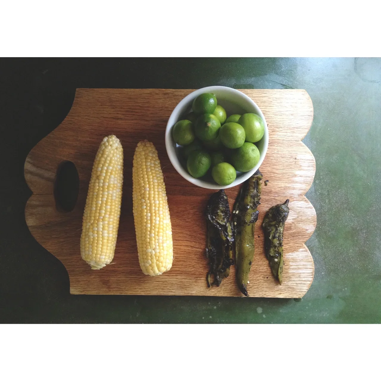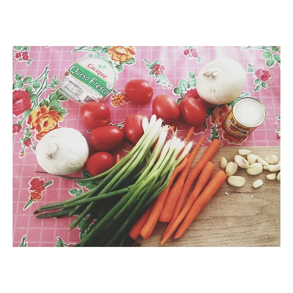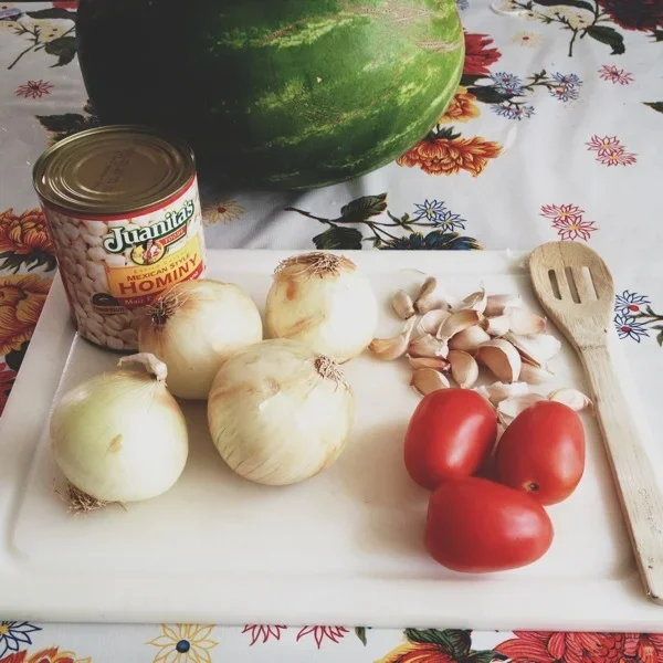 Some of the ingredients for posole, ready for Clementine to start chopping.