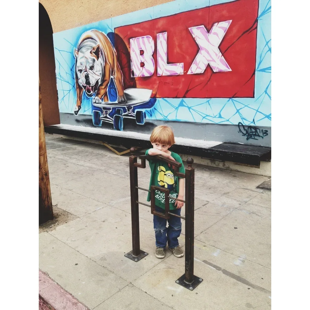 Viggo, at the sk8 shop, but eyeballing his favorite place to play across the street: Playformance