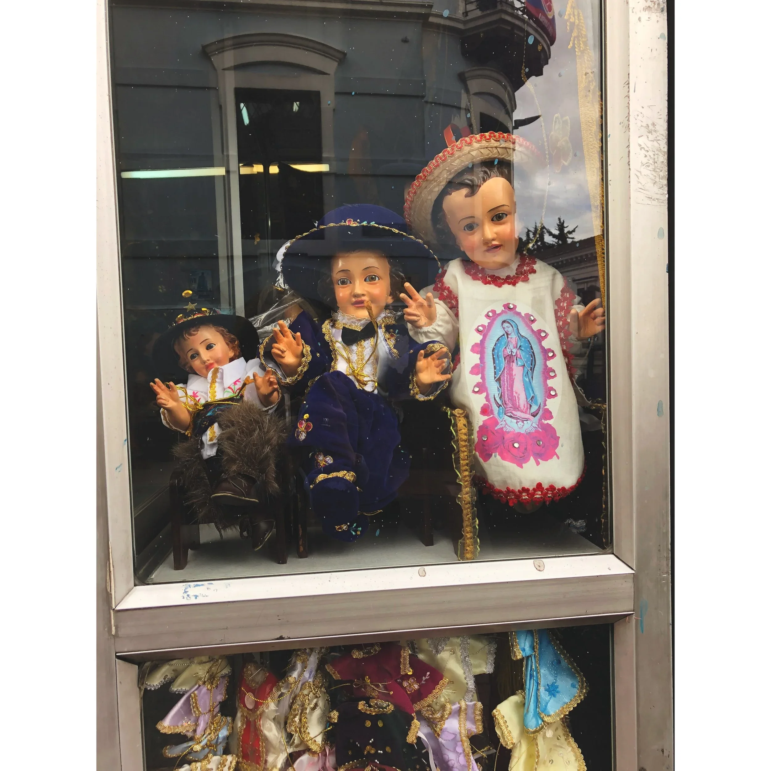 Shop window in Centro Historico, Quito. This street was devoted to selling religious dolls and the clothes to dress them. Each street had a different item to sell. For instance, one street was filled with yarn shops, the next with religious candle shops, and so on.